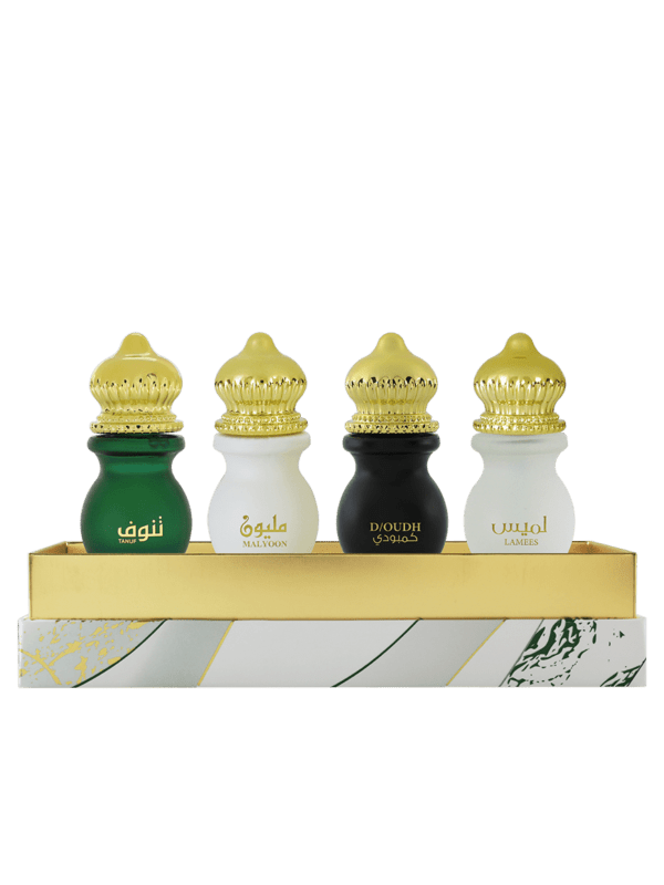 The Giftset contains ( Tanuf Oil e12 ml , Malyoon Oil e12 ml , Lamees Oil e12 ml , D/oud AMG Oil e12 ml )
